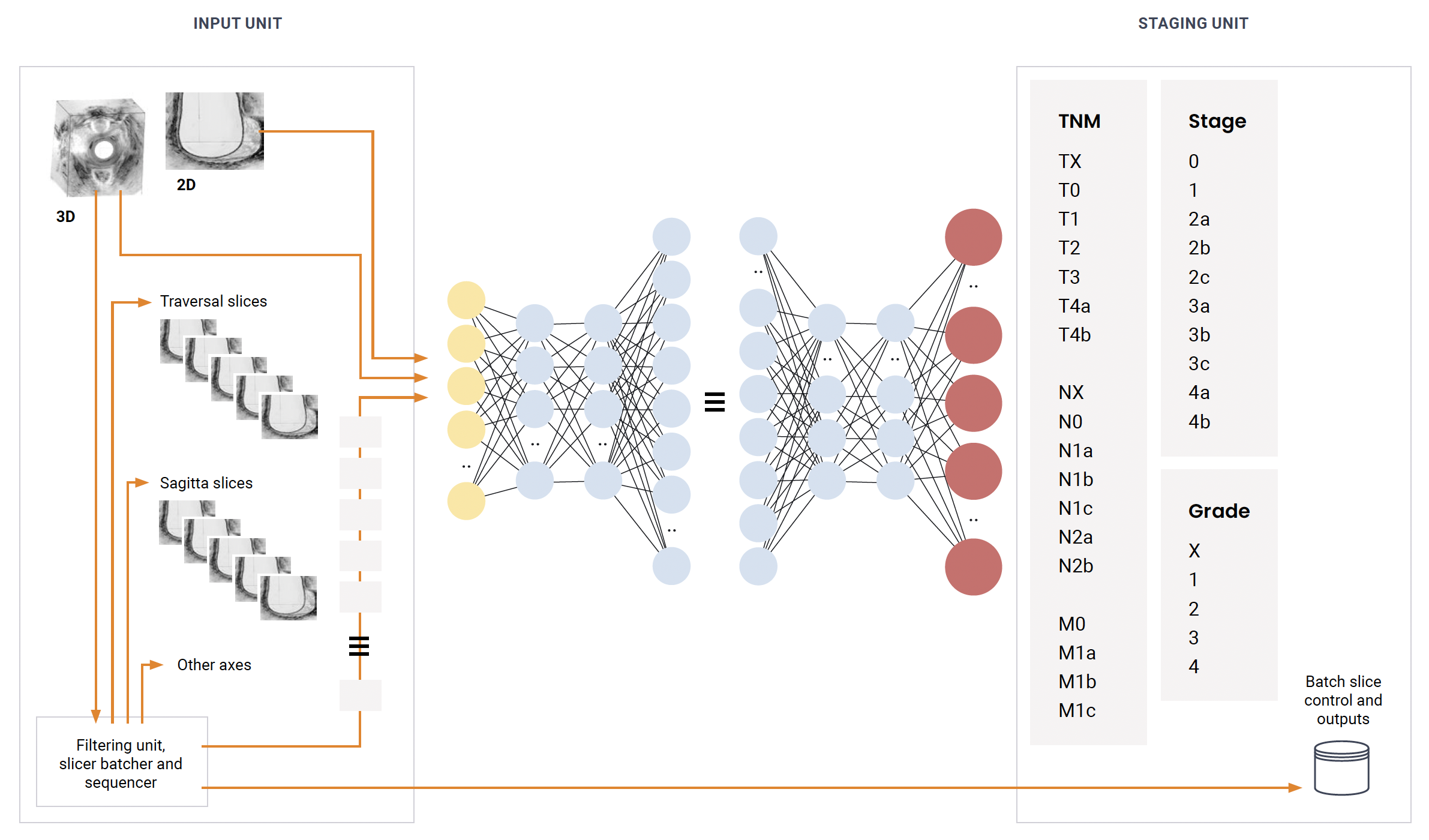 The core of our system is a Unet model, a CNN architecture adept at image segmentation tasks. Trained initially on fully labeled images and supplemented with partially labeled data, it extracts and refines features critical for precise tumor identification and staging. The model’s scalability allows it to extend from 2D to comprehensive 3D volume analysis, culminating in detailed segmentation maps essential for clinical decision-making.